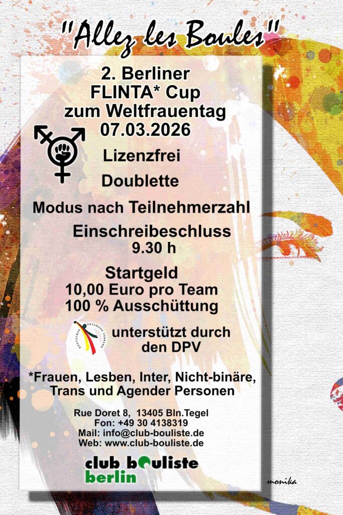 auf Wunsch unserer Inklusionsbeauftragten Petra möchte ich ausnahmsweise auf ein Boule-Turnier hinweisen, das nicht vom NPV veranstaltet, aber vom DPV unterstützt wird: Auf das FLINTA-Turnier am 07.03.2026 in Berin.
